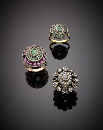 Lotto di tre anelli in oro giallo, rosso e argento rifiniti con diamanti, smeraldi, rubini e zaffiri, g.22,50 misure da 14/54 a 17/57 Lot of three yellow and red gold, silver, diamond, emerald, ruby and sapphire rings, g.22,50 size from 14/54 to 17/57
