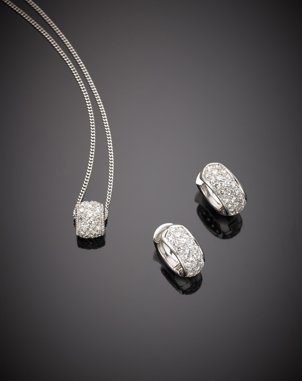 Orecchini ad anello e pendente con catenina in oro bianco a pavé di diamanti,...