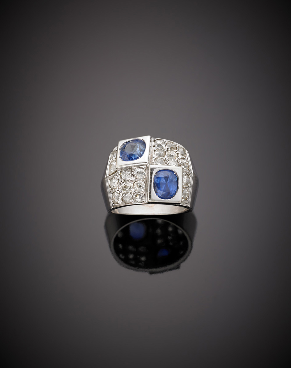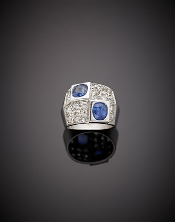 Anelllo in oro bianco con diamanti rotondi a pavè e due zaffiri di forma a...