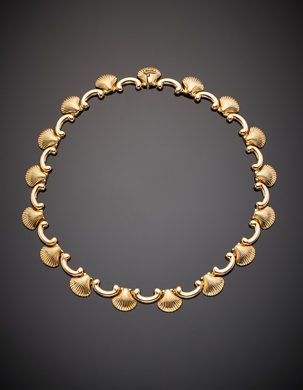 Collier in oro giallo con motivo a conchiglie, g. 38,70 lungh. cm 40 circa Yellow gold necklace with a shell pattern g. 38,70 length cm 40 circa