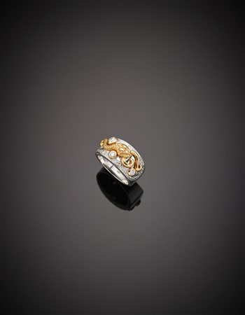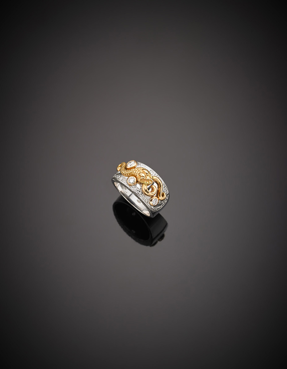 CAZZANIGA Anello a fascia, in oro bianco e giallo con serpente in rilievo e tre diamanti, g. 10,60, misura 12/52 CAZZANIGA Bi-coloured gold band ring with snake and three diamonds, g.10,60, size 12/52