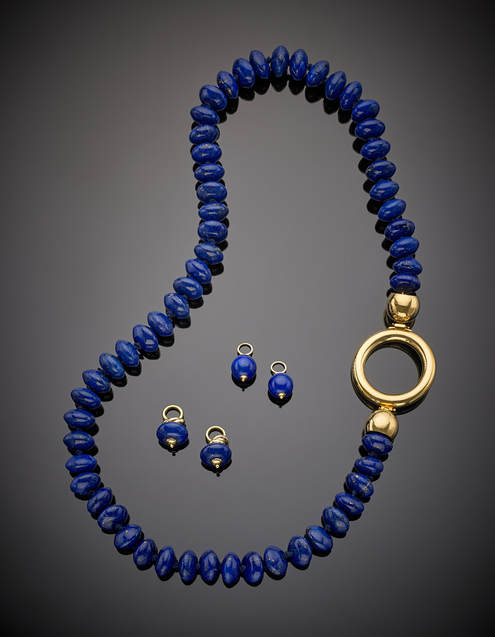 Collana a rondelle con ciondoli in lapislazzuli rifiniti in oro giallo, g.238,30 lungh. cm 73,5 circa Tapered lapis bead necklace and pendants with yellow gold clasps, g.238,30 length cm 73,5 circa