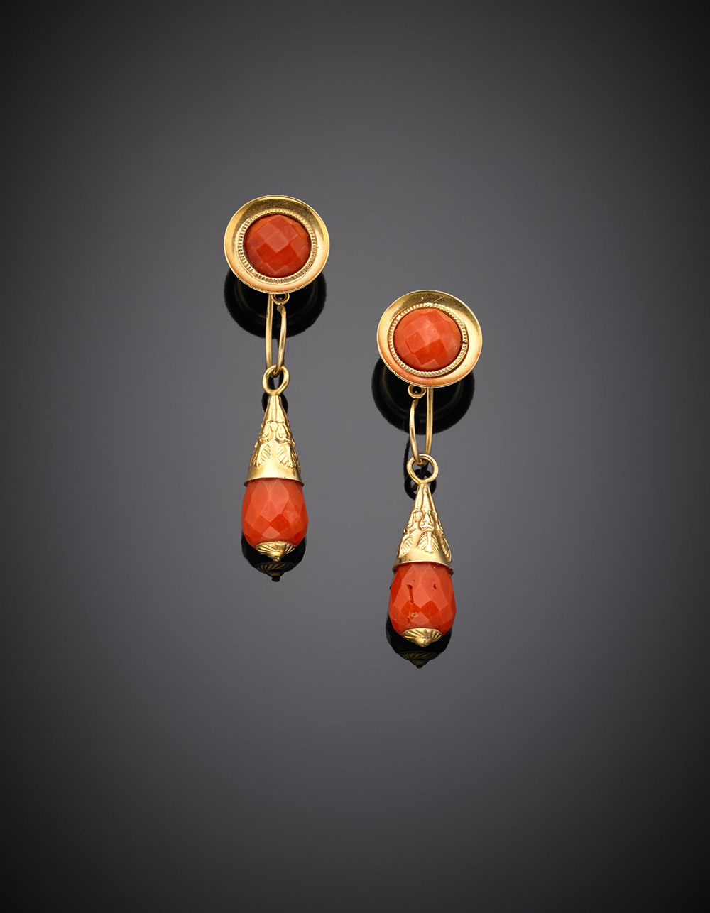 Orecchini pendenti in oro giallo con corallo rosso sfaccettato, g.7,80 lungh....