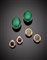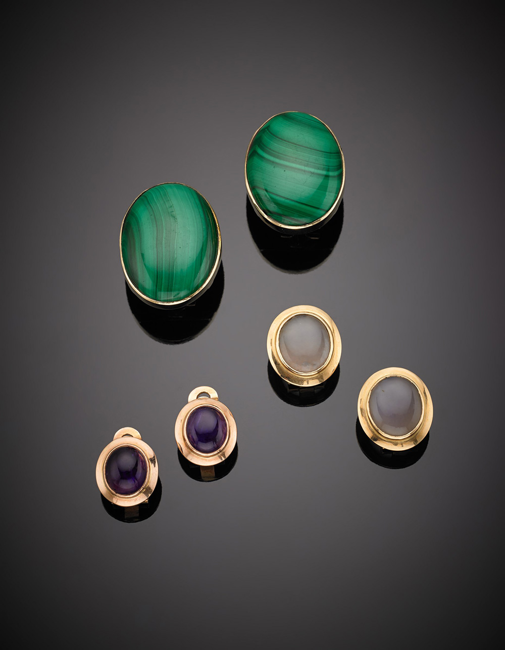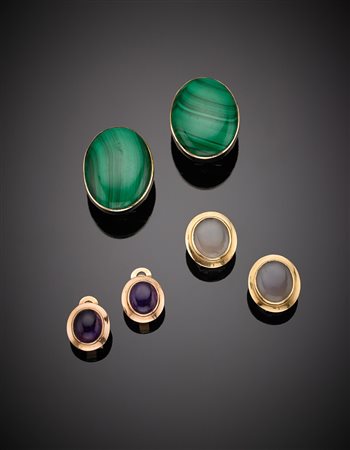 Lotto composto da tre paia di orecchini con clip in oro giallo, con malachite, ametista e calcedonio ovali e cabochon, complessivi g.41,10 Lot of three pairs of oval, cabochon malachite, amethyst and chalcedony earrings, in all g.41,10