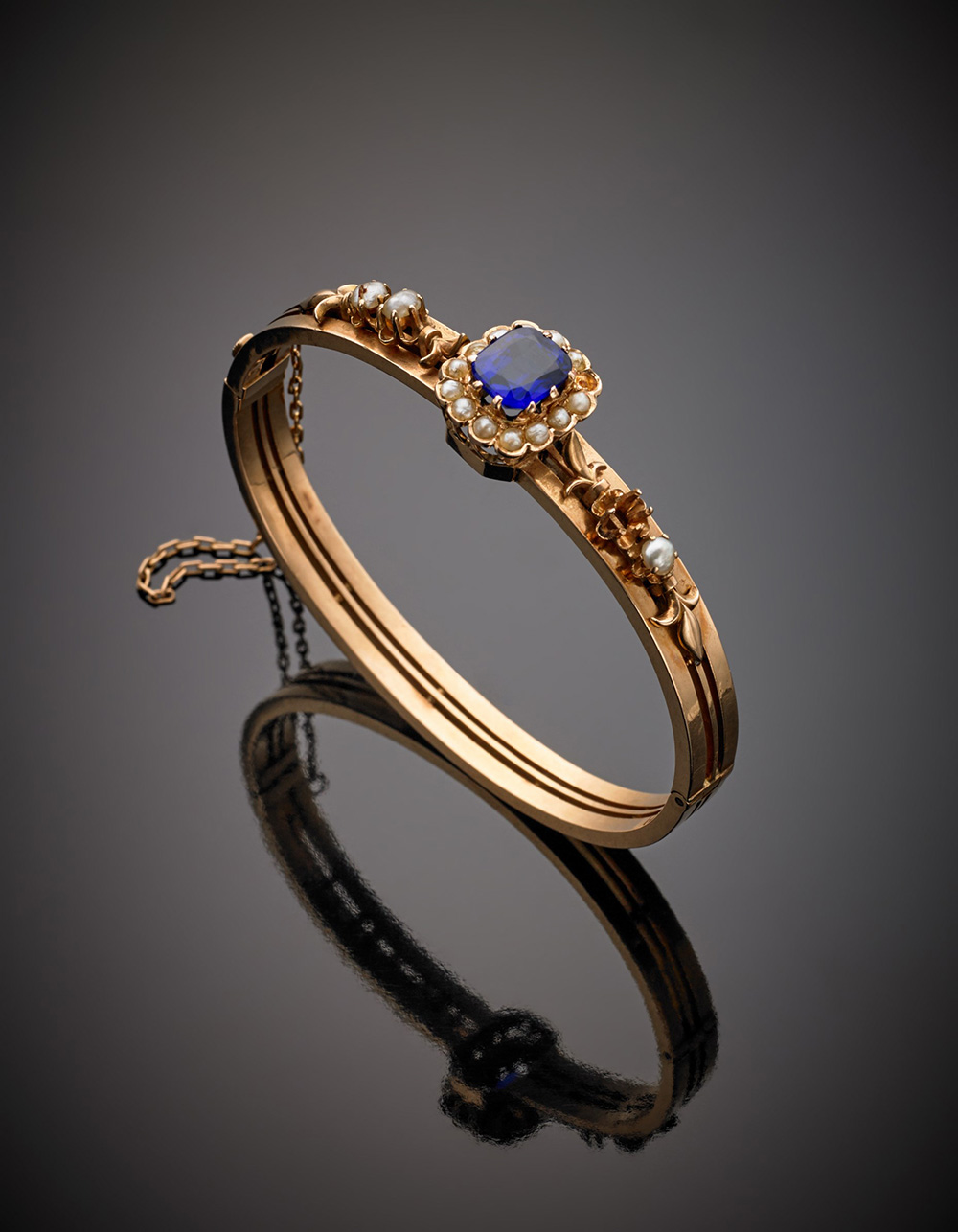 Bracciale rigido in oro rosso rifinito con piccole perle ed al centro uno zaffiro sintetico di forma a a cuscino, g.17,60 diam. cm 6,00 circa (difetti, mancanze)