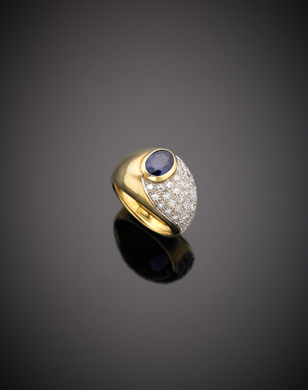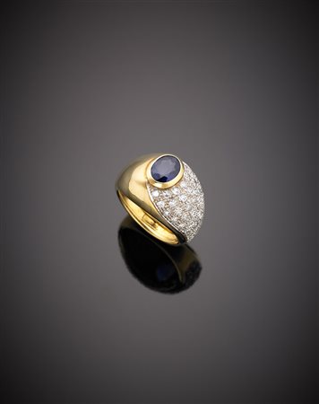 CATTANEO CARLO Anello in oro giallo con pave di diamanti su oro bianco ed al centro uno zaffiro ovale di ct.1,02 circa, g.7,30, misura 12/52 CATTANEO CARLO Bi-coloured gold diamond pavé and ct.1,02 sapphire ring g.7,30 size 12/52
