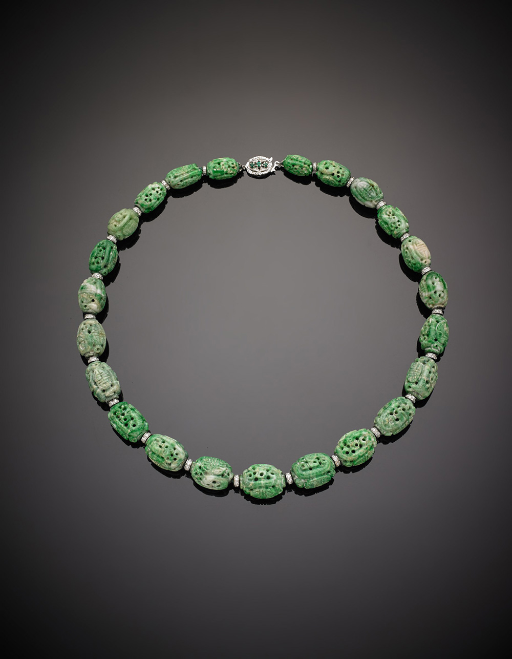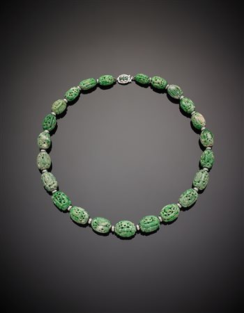 Collana di barilotti in giada scolpiti e scalati distanziati da tondini in oro bianco e diamanti, la chiusura in oro bianco e smeraldi, g. 144,20, lungh. cm 54 circa Carved jadeite graduated bead and white gold diamond spacer necklace, white gold emerald clasp, g.144,20 length cm 54 circa