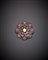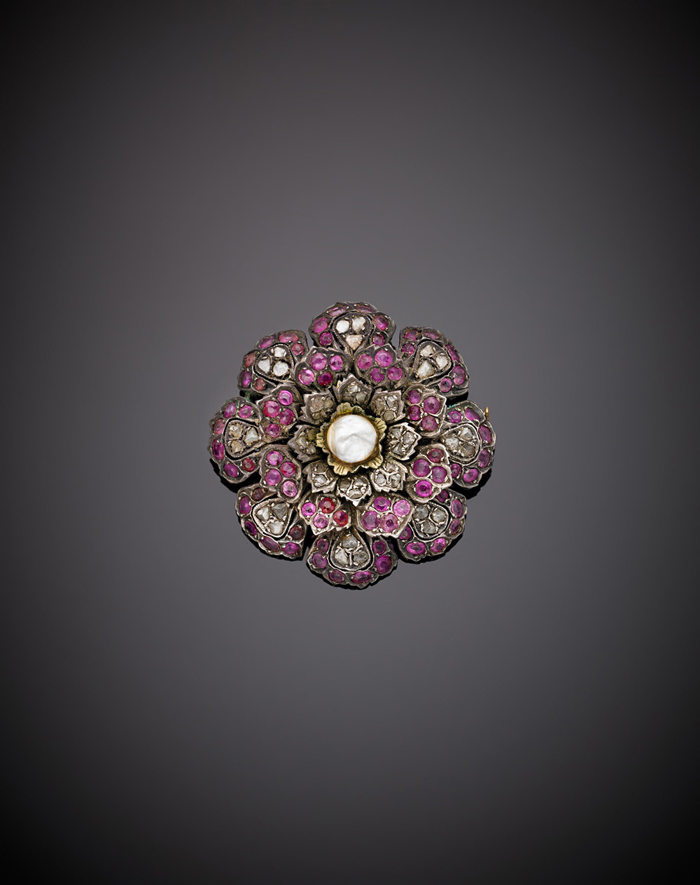 Spilla/pendente tremblant in argento con spillone in oro rosso 333/1000, rifinita con diamanti, rubini e una mezza perla centrale, g. 23,30, diam. cm 4,50. In scatola originale Silver "en tremblant" flower brooch/pendant with diamonds, rubies and a central half pearl , the pin is in 9K gold, g.23,30, diam. cm 4,5 circa. In original box