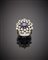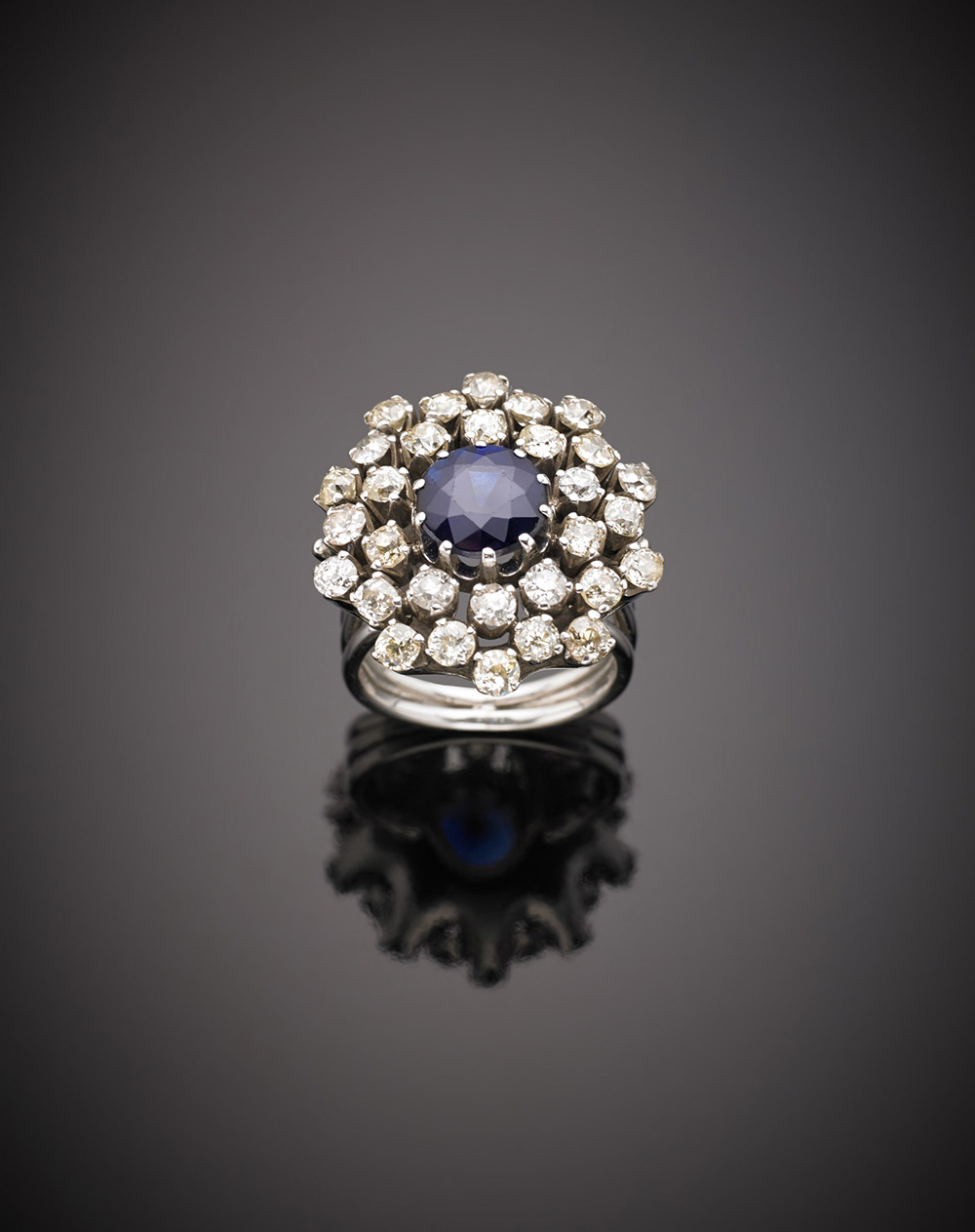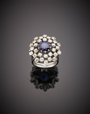 Anello in oro bianco con diamanti rotondi a contornare una doppietta di zaffiro, g.14,00 misura 14/54 White gold diamond layered sapphire ring, g.14,00 size