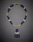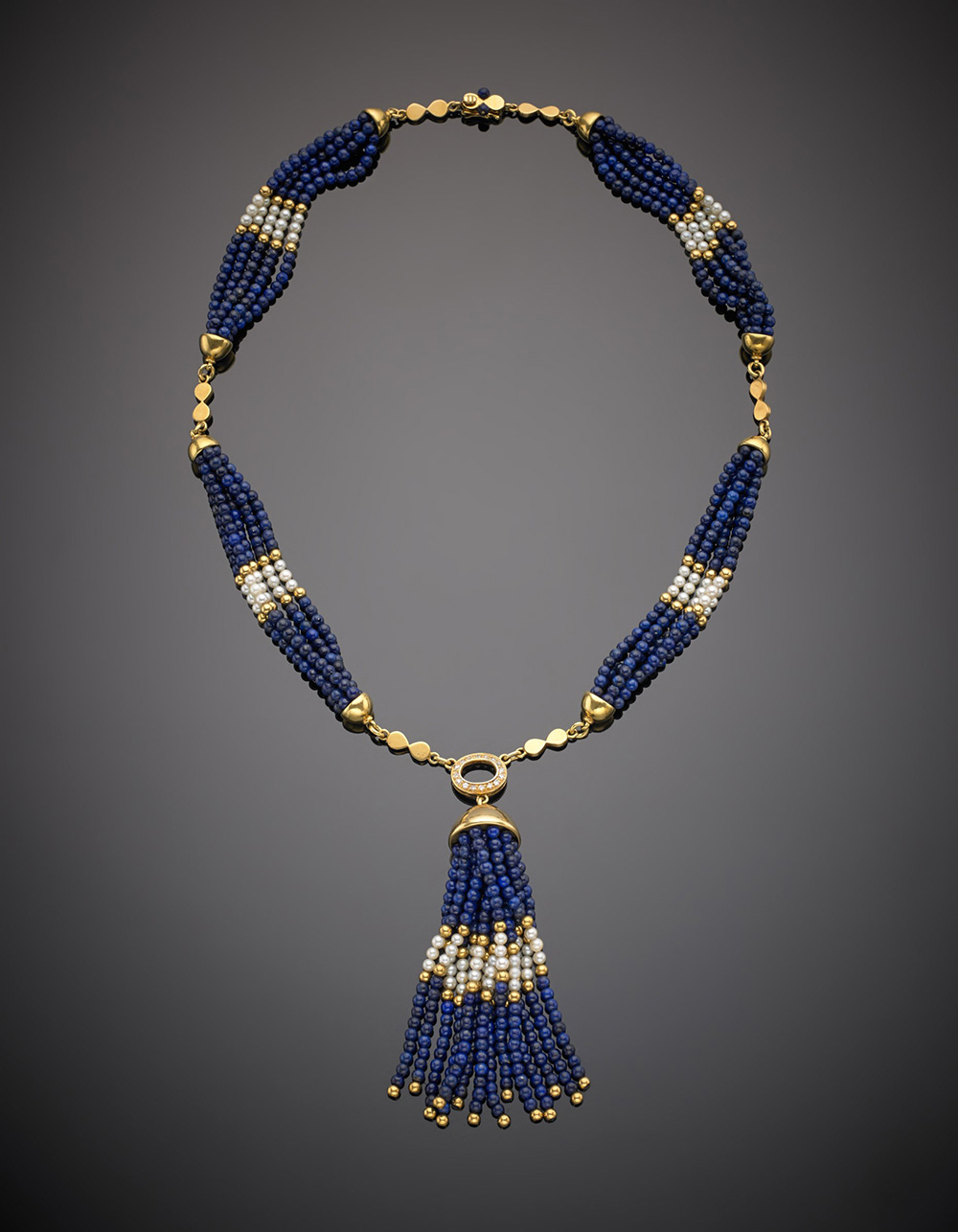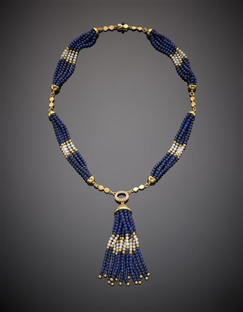Collana in oro giallo perle e lapis a più fili con nappa centrale, rifinita con diamanti, g. 69,30 lungh. cm 50 lunghezza nappa cm 7,5 circa Yellow gold multi-strand lapis and pearl necklace and tassel accented with diamonds, g. 69,30 lungh. cm 50 tassel length cm 7,5 circa