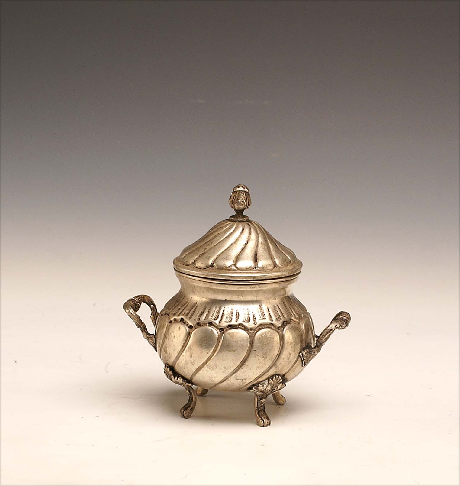 Zuccheriera con coperchio in argento poggiante su quattro piedini, vecchia manifattura, gr. 329, h. cm. 15.