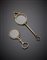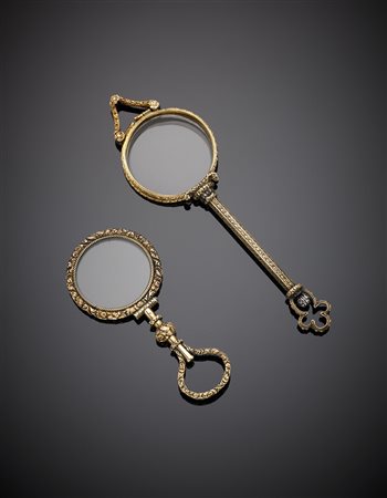 Coppia di lorgnette in oro cesellato e inciso g.40,70 lungh. cm 12,80 e cm 8,1 circa ( mancanza) Two yellow chiselled and carved gold lorgnettes, g.40,70 lungh. cm 12,80 e cm 8,1 circa (loss)