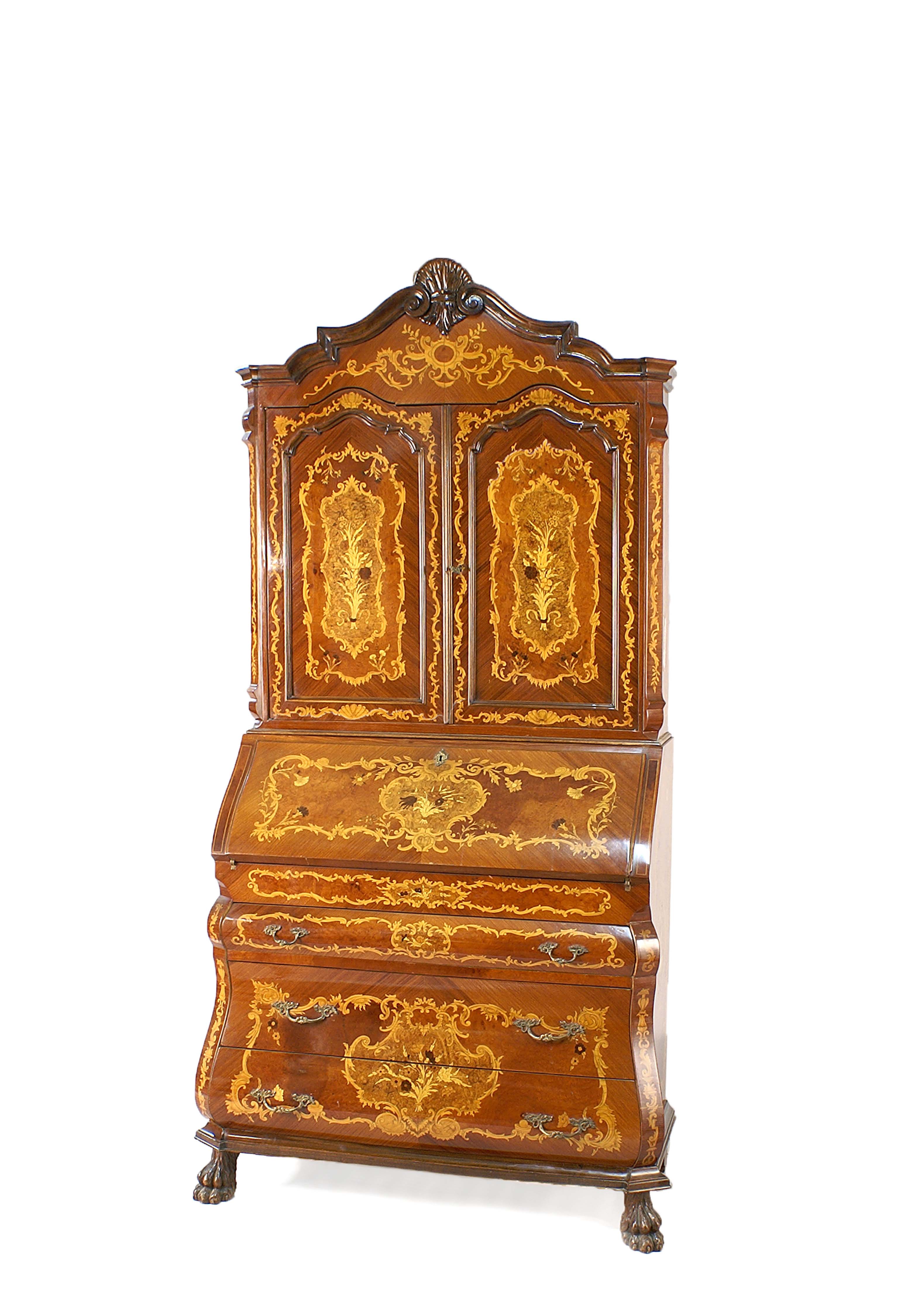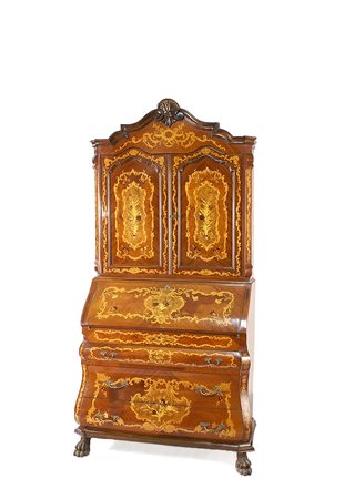 Trumeau in palissandro intarsiato a motivi floreali in legni di frutto diversi, parte superiore a due sportelli, parte inferiore con calatatoia celante tiretti e scomparti vari e tre cassetti sottostanti poggianti su piedi ferini, Olanda vecchia manifattura, cm. 220x106x53.