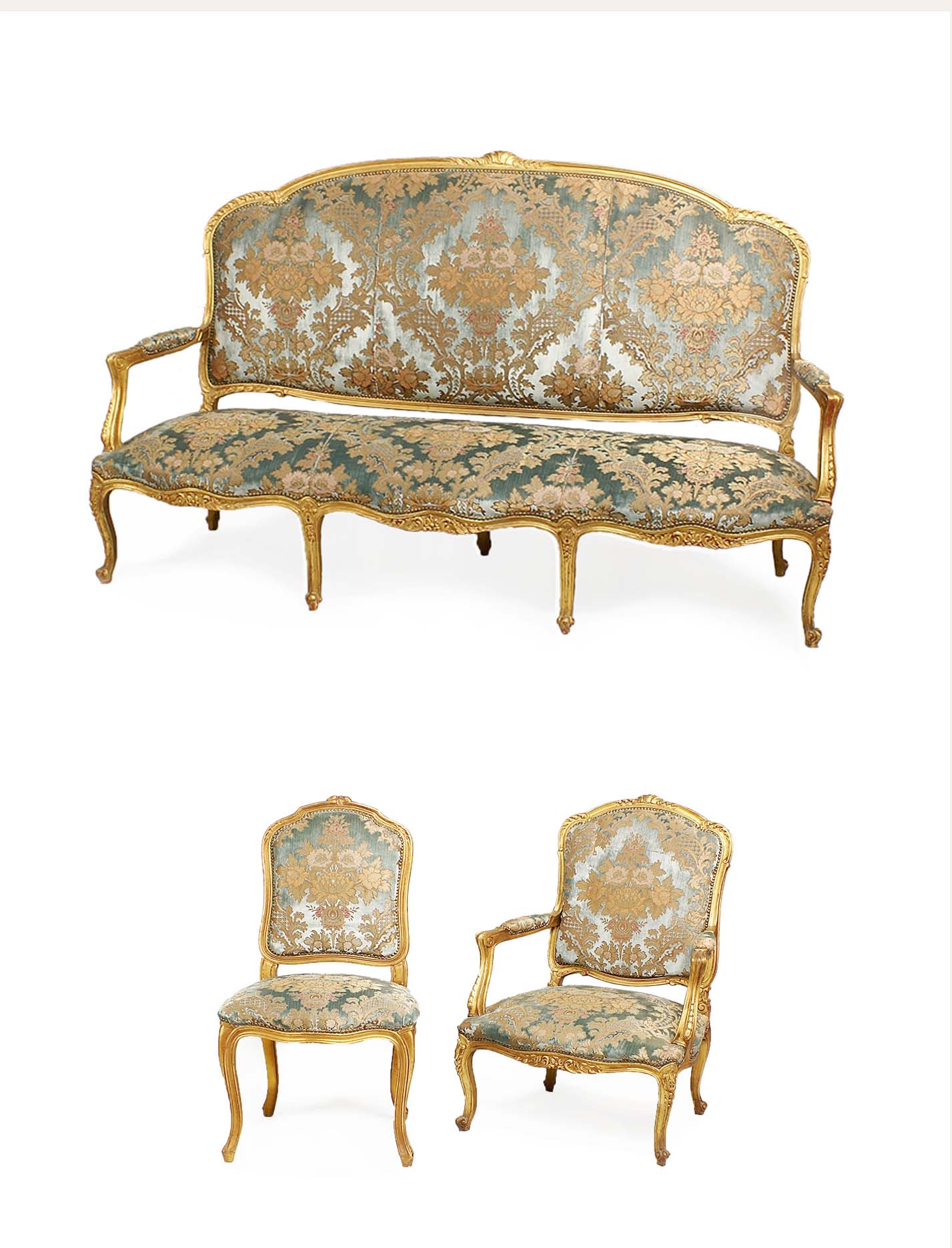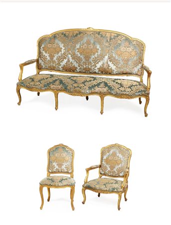 Salotto in legno dorato ed intagliato composto da un divano, due poltrone e...