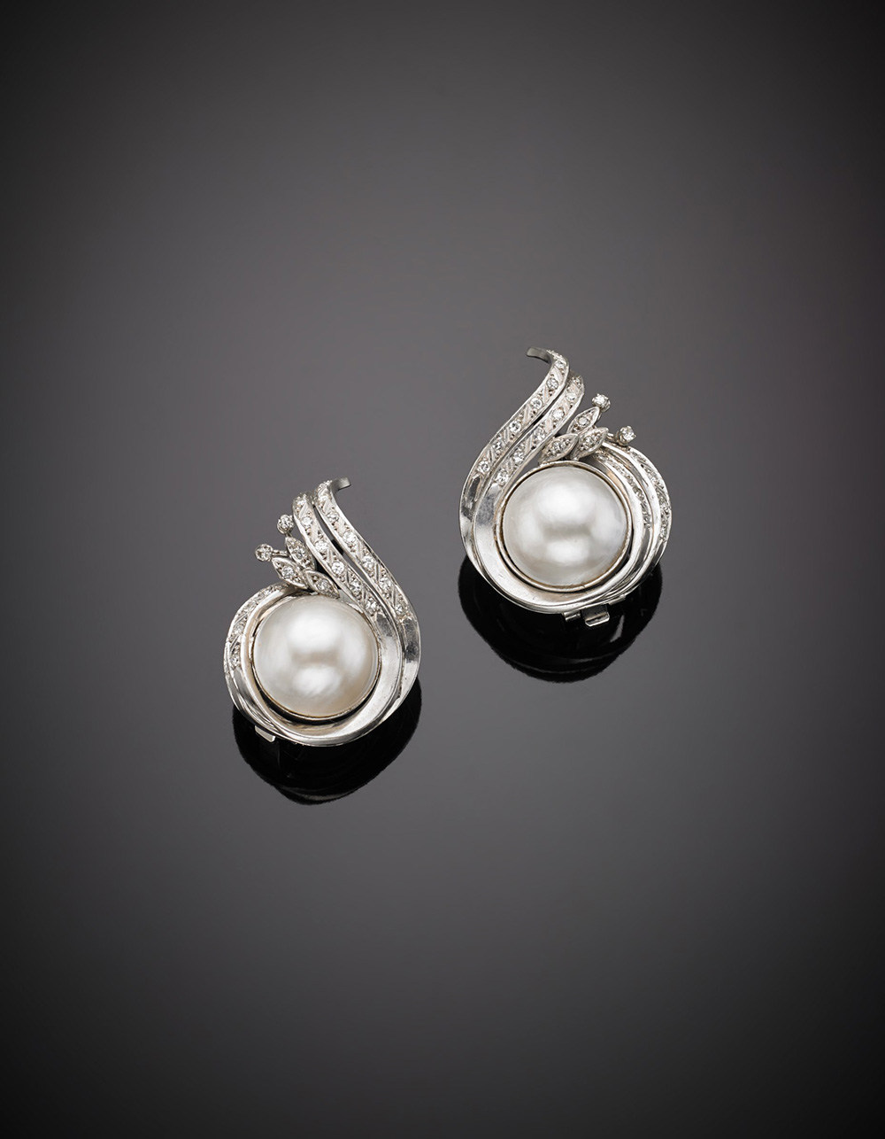 Orecchini a lobo con clip in oro bianco e diamanti a contornare due perle mabè di mm 15,50 circa, g. 21,20 White gold diamond and mm 15,50 mabé pearl earclips, g.21,20