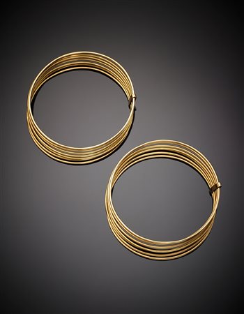 Due bracciali ognuno composto da sette cerchi tenuti da barrette tutto in oro giallo, g.78,40, diam. cm 7 circa Two yellow gold seven hoop bracelets with spacers, g.78,40 diam. cm 7 circa