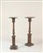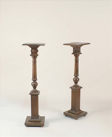 Coppia di colonne in noce, piano quadrato poggiante su sostegno a balaustro,...
