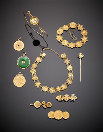 Lotto in oro giallo 750/1000 composto da due spille uno spillone, due medaglie e tre bracciali , per complessivi g. 58, unito a una spilla ed una medaglia con giadaite in oro 333/1000 per complessivi g. 67,70, tutto decorato con ideogrammi 18K yellow gold lot comprising two brooches, a pin, two medals and three bracelets, in all g.58, together with a 9k brooch and jade medal in all g.67,40, all decorated with ideograms