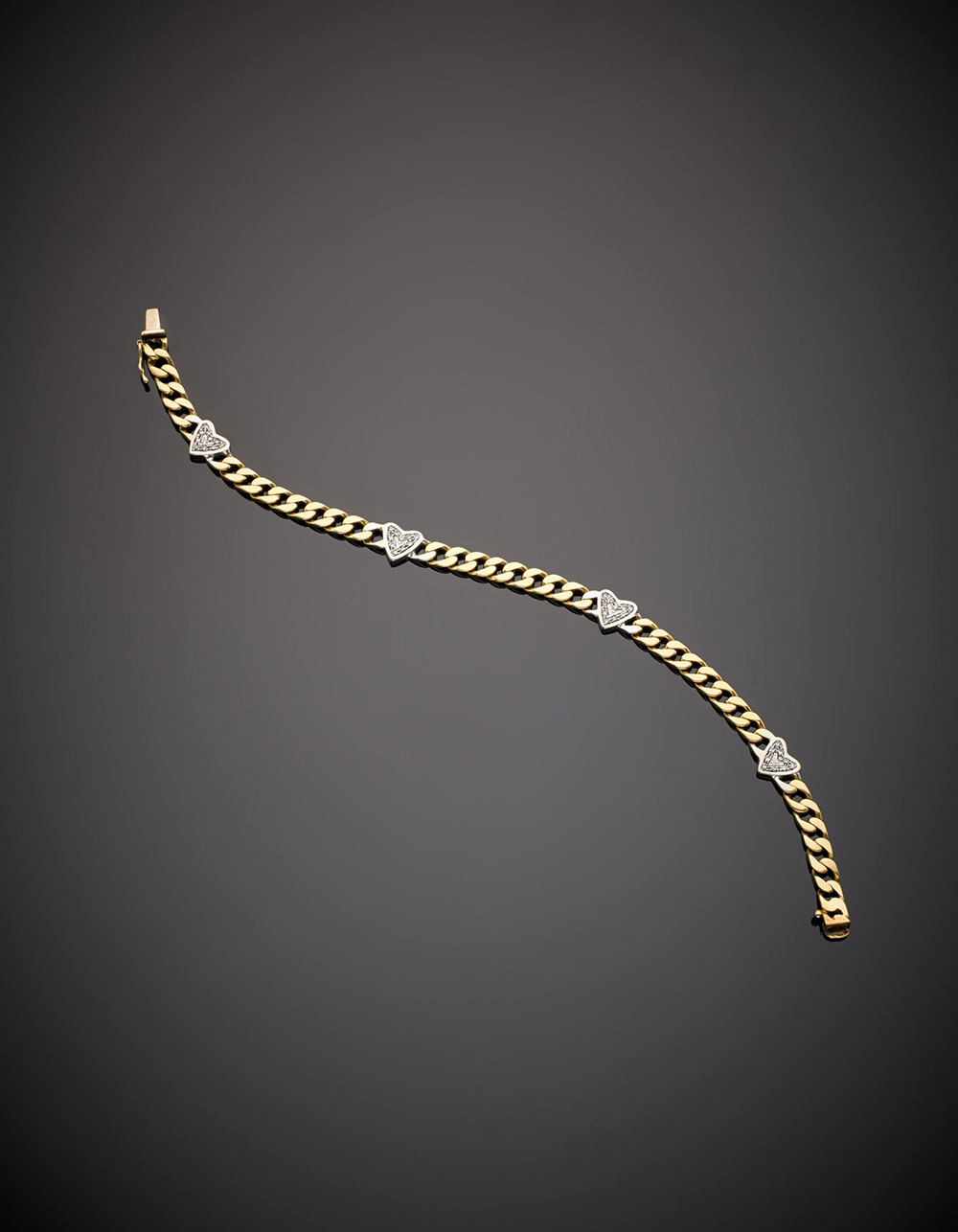 Bracciale in oro giallo e bianco a maglia groumette con cuoricini con diamanti, g.21,10 lungh. cm 20,5 circa Bi-coloured gold groumette mesh bracelet with diamond pavé hearts, g.21,10 length cm 20,5 circa