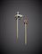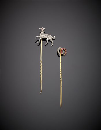 Due spilloni a guisa di levriero e di ferri di cavallo, in oro giallo e bianco, diamanti e rubini , complessivi g.3,60 Two bi-coloured gold diamond and ruby greyhound and horse-shoe tie-pins, in all g.3,60