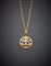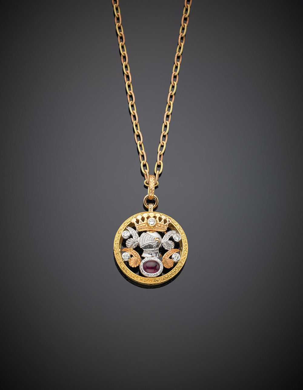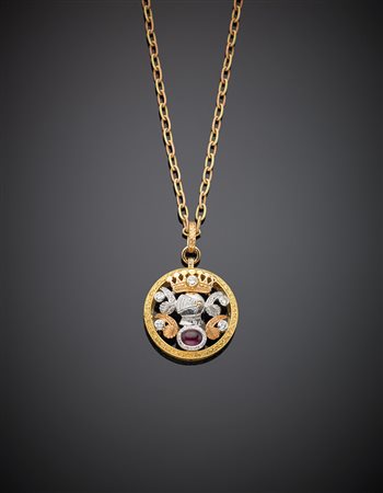CAZZANIGA Catena e pendente traforato con decorazione araldica in oro bianco, giallo e rosa, cesellato, con rubino cabochon e diamanti, g. 22,20 lungh. cm 51 CAZZANIGA Tri-coloured chiselled gold chain and heraldic openwork pendant accented with ruby and diamonds, g.22,20 length cm 51