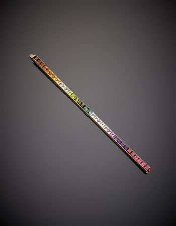 Bracciale in oro giallo con gemme di varia colore e sfumatura a carrè, g. 31,80, lungh. cm 18 circa Yellow gold multi-coloured carré gem-set, g. 31,80, length cm 18 circa
