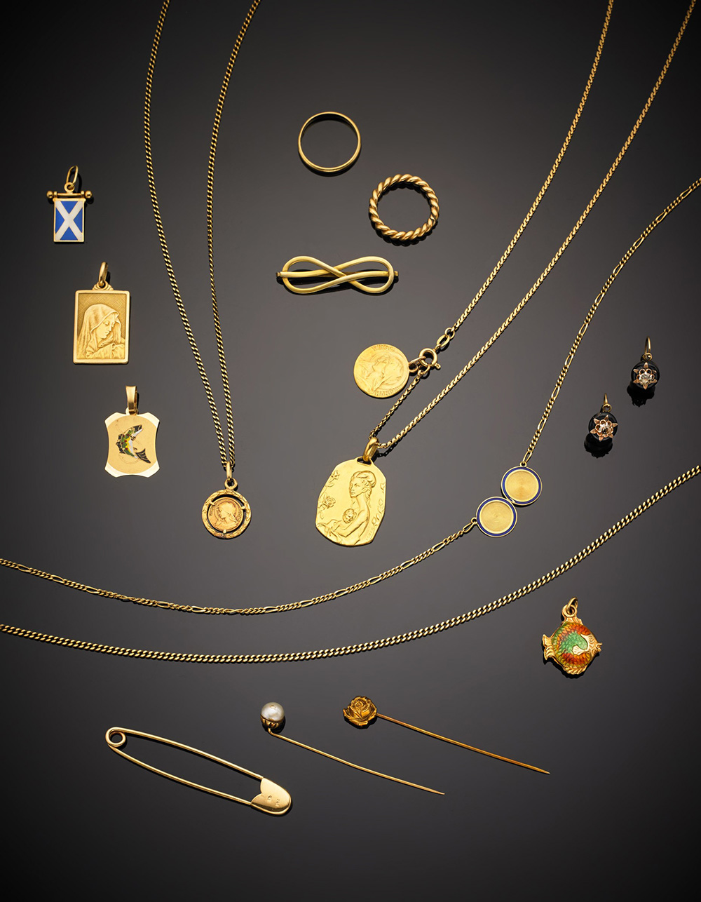 Lotto composto da svariati piccoli oggetti in oro, catenine, medaglie, ciondoli, fedine, orecchini, spille, spilloni, e una losanga, per complessivi g.68,00 Yellow gold lot composed of linkchains, medals, pendants, rings, earrings, pins, tie-pins and a lozenge, in all g.68,00