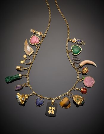 Collana in oro giallo con charms arricchiti da varie gemme, g. 158,10 Yellow gold gem-set charms necklace, g.158,10