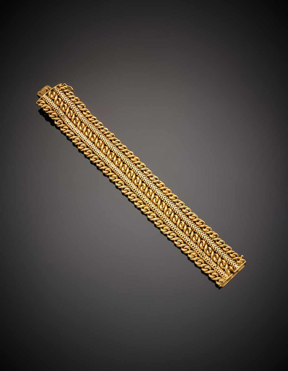 Bracciale a fascia in oro giallo, g.55,60, lungh. cm 19,5, h cm 2,5 circa Yellow gold band bracelet, g.55,60, length. cm 19,5