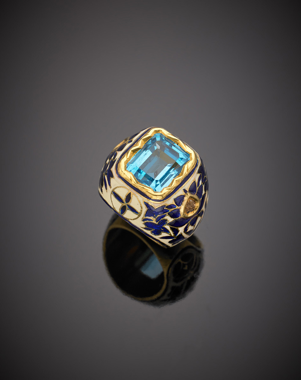 Anello in oro giallo con smalti, diamanti e al centro un topazio azzurro ottagonale, g.25,80, misura 15/55 Yellow gold, enamel and diamond ring with an octagonal blue topaz, g.25,80, size 15/55