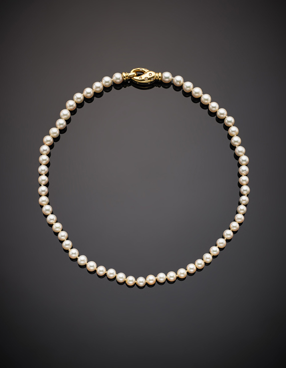 Collana ad un filo di perle Akoya chiusura oro e diamanti, g.43,70 lungh. cm 45,5 circa Single strand Akoya pearl necklace with yellow gold and diamond clasp, g.43,70 length cm 45,5 circa
