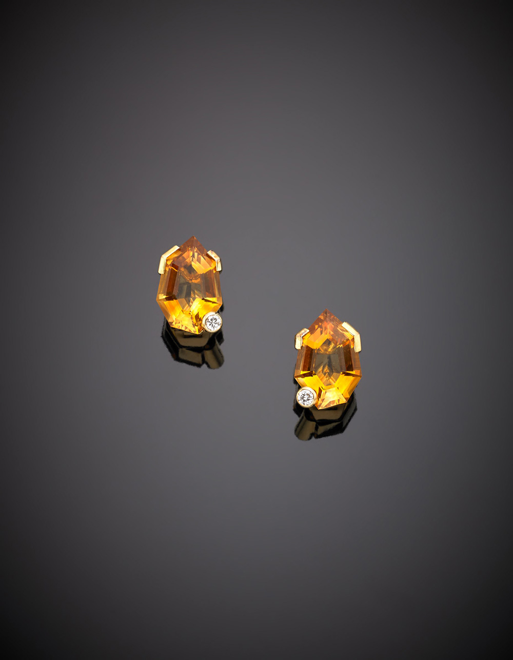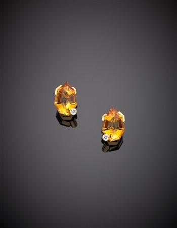 CATTANEO CARLO Orecchini a lobo in oro giallo con due quarzi citrini di forma fantasia, rifiniti con due diamanti rotondi, g.11,50 CATTANEO CARLO Yellow gold and diamond phantasy cut citrine quartz earrings, g.11,50