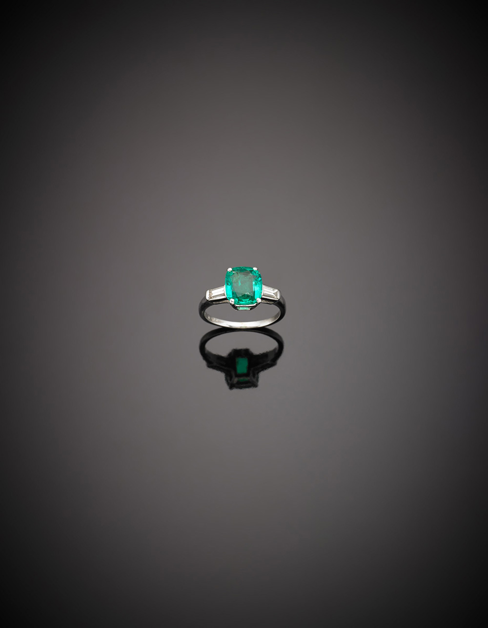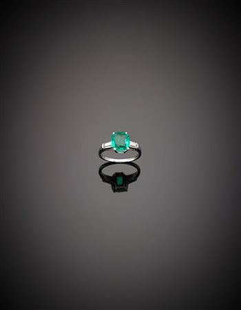 Anello in platino con smeraldo di forma a cuscino di ct 1,30 circa e due diamanti baguette, g. 3,60, misura 10/50