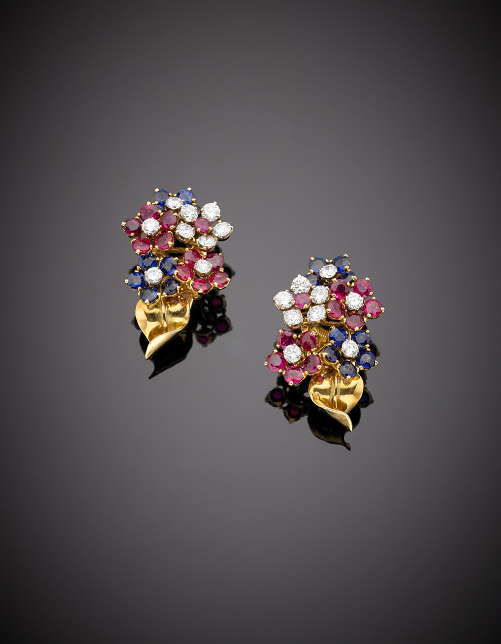 Orecchini a lobo in oro giallo con clip, disegno floreale, con zaffiri, rubini e diamanti, g. 18,90 Yellow gold flower earclips with sapphires, rubies and diamonds, g. 18,90