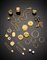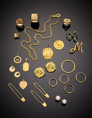 Lotto composto da quattro fedine in oro giallo, tre anelli in oro giallo e rosso, una catena a torciglione, un fermamonete, due spille e tre da balia in oro giallo, sei medaglie di varie dimensioni anche con smalti, due ciondoli in oro giallo e rosso, due paia di orecchini in oro giallo, complessivi g.127,5 Yellow and red gold lot composed of: four wedding bands, three gold rings, a twisted rope linkchain, a moneyclip, two pins and three safety-pins, six medals, two pendants, two pair of earrings, in all g.127,5