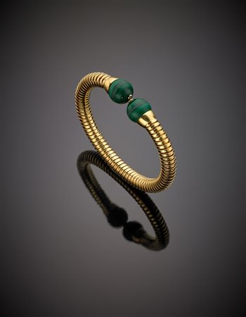 Bracciale semirigido in oro a tubo-gas rifinito con boules in malachite, g.43,50 diam. cm 5,70 circa Yellow gold tubo-gaz malachite bead cuff bracelet, g.43,50 diam. cm 5,70 circa