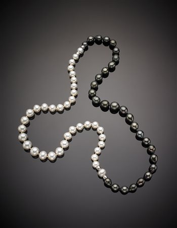 Collana lunga in perle South-sea composta da una di perle bianche mm 10,20/13,40, da tonde ad ovaloidi con chiusura a scomparsa, lungh. cm 42 allungabile ad una di perle Tahiti nere mm 10,30/13,50 a pera, chiusura in oro bianco lungh. cm 42 complessivi g.143,30 Long detachable double South-sea pearl necklace composed of one with white mm 10,20/13,40, from round to ovaloid pearls and hidden clasp, length cm 42, adjustable to one with black Tahiti mm 10,30/13,50, pear shaped pearls and white gold clasp length cm 42, in all g.143,30