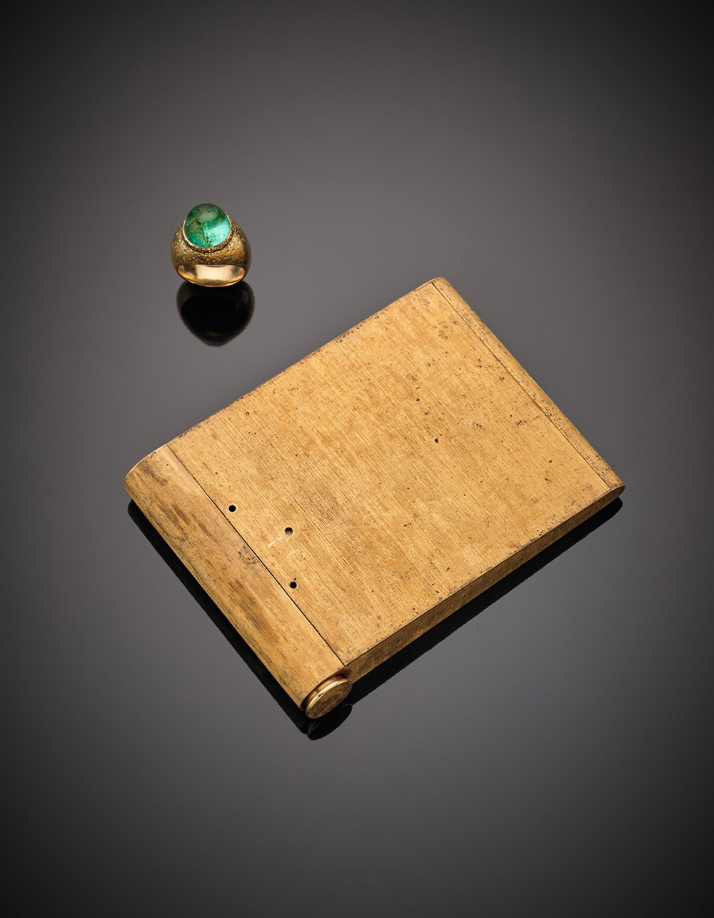 Lotto composto da portacipria con rossetto e anello con smeraldo rotondo cabochon, tutto in oro giallo satinato e inciso, g.171,30 anello misura 4,50/44,50 Yellow glazed and carved gold group of jewellery composed of powder and lipstick compact and emerald cabochon ring, g.171,30 ring size 4,50/44,50