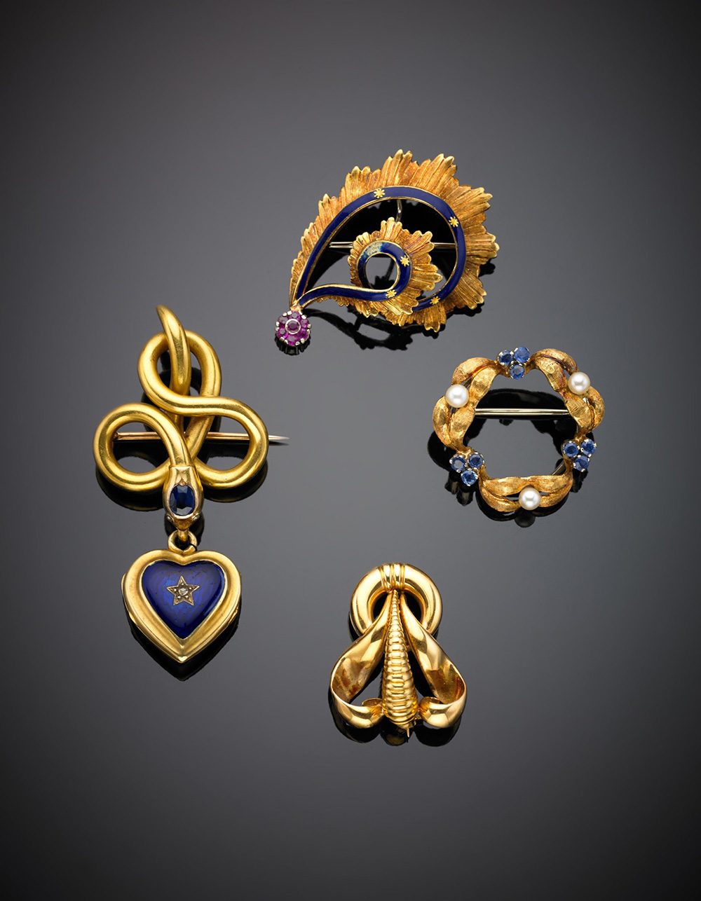 Lotto composto da quattro spille in oro giallo e rosso con smalti blu, diamanti, rubini, zaffiri e perle, complessivi g.31,80 Lot compopsed of four red and yellow gold diamond ruby sapphire, pearl and blue enamel brooches, in all g.31,80