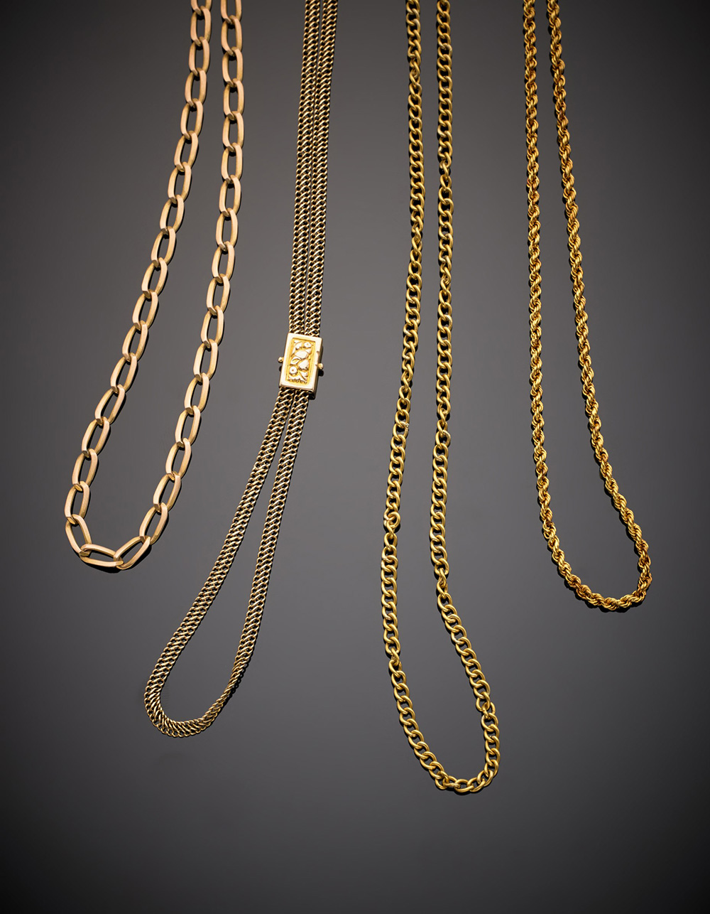 Lotto composto da quattro catene in oro giallo e rosso di diverse lunghezza e manifattura, complessivi g. 142,40 Yellow and red gold lot comprising four linkchain necklaces of different mesh and length, in all g.142,40
