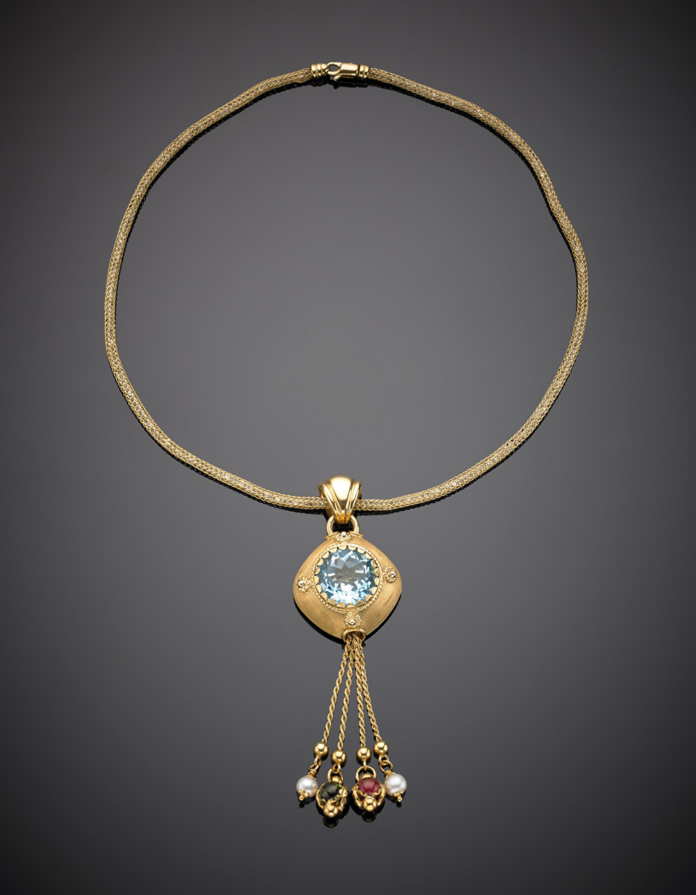 EMOZIONI Pendente con catena a fune animata di quarzi in oro giallo lucido e satinato, con nappa terminata da perle e tormaline, al centro un topazio azzurro rotondo, g. 32,50 lungh. cm 42,5 circa EMOZIONI Yellow partly glazed gold mesh quartz necklace and topaz pendant with tourmaline and pearl tassel, g. 32,50 length cm 42,5 circa