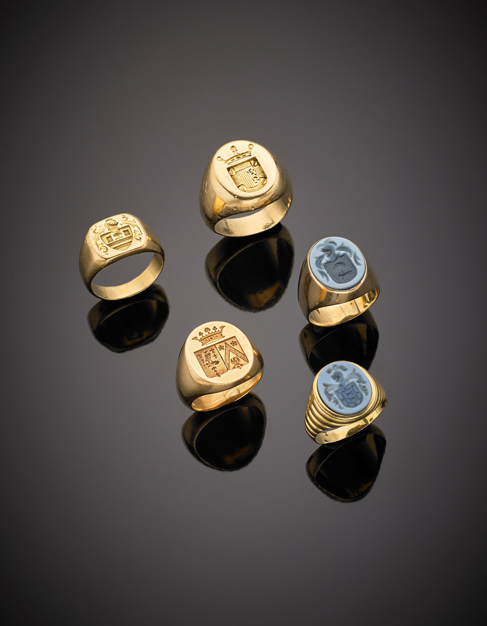 Lotto composto da cinque anelli in oro giallo e pietre tutti incisi con sigilli nobiliari, complessivi g.45,20 misura da 7/47 a 12/52 Lot composed of five yellow gold and blue signet rings, g.45,20 size from 7/47 to 12/52