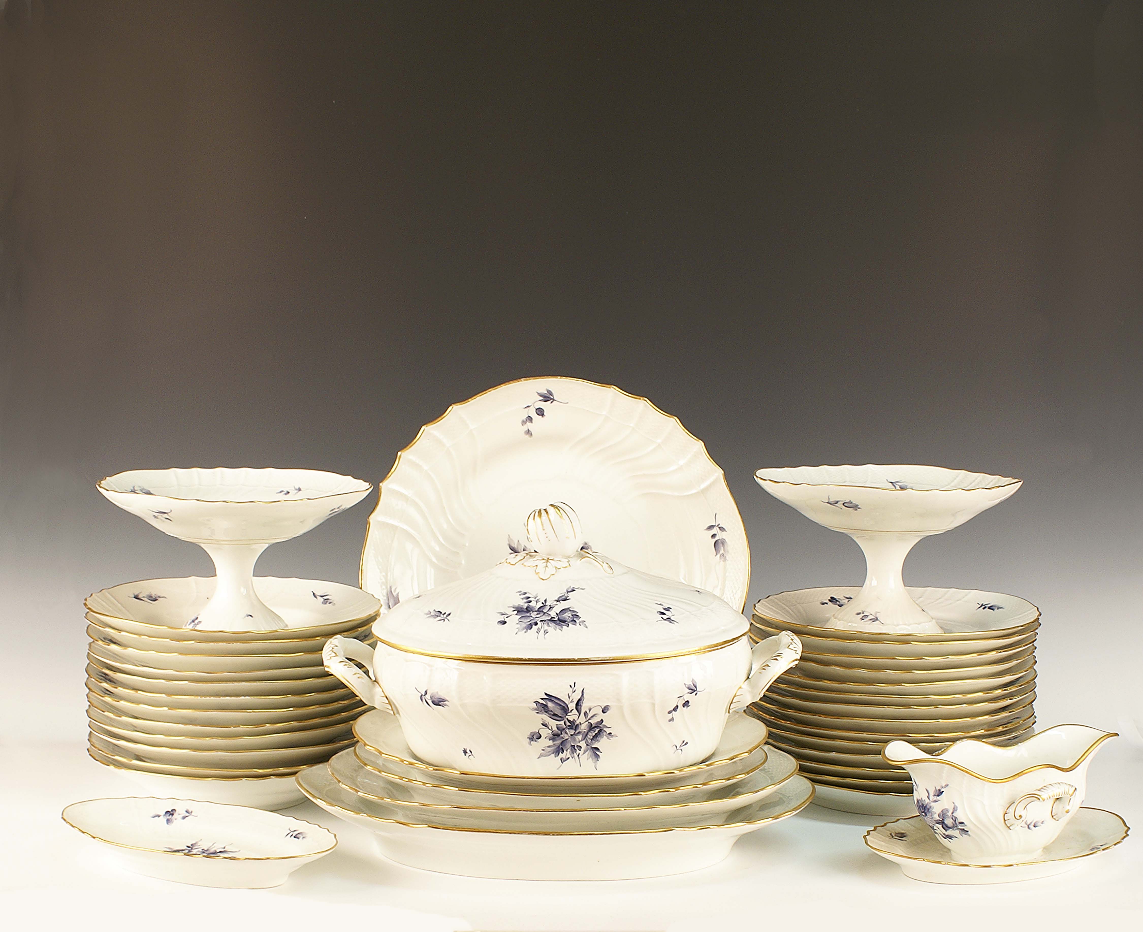Servizio di piatti in porcellana bianca decorata a motivi floreali azzurri e profilata in oro, composto da trentasei piatti piani, dodici piatti fondi, dodici piatti frutta, una zuppiera, sei piatti da portata, una salsiera, due alzate e una raviera, manifattura Richard Ginori.