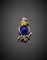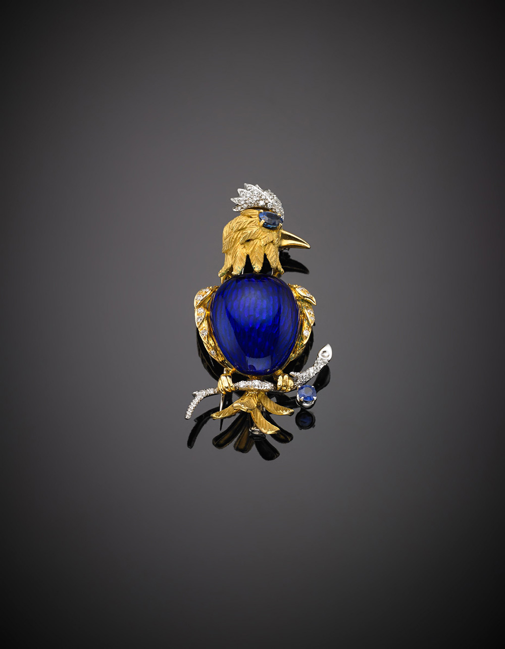 Spilla a guisa di nibbio in oro giallo, diamanti, zaffiri e smalto blu,...