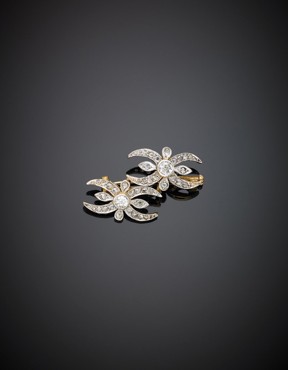 Spilla in oro giallo, bianco e diamanti a guisa di fiori stilizzati, g.3,60...