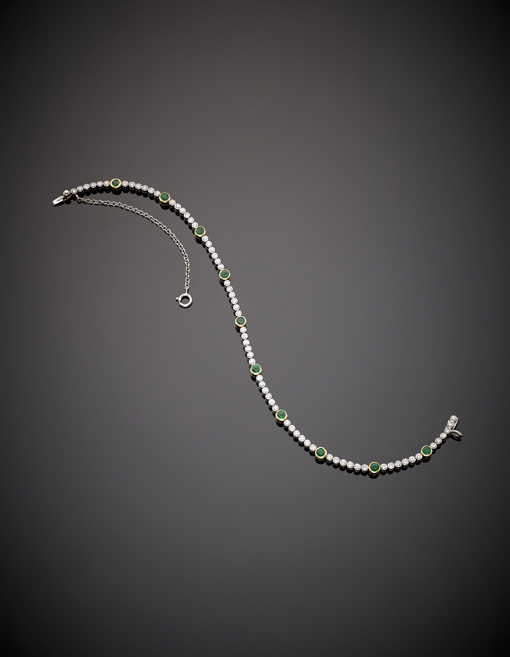 Tennis in oro giallo e bianco, diamanti e smeraldi, g.8,70 lungh. cm 18 circa...