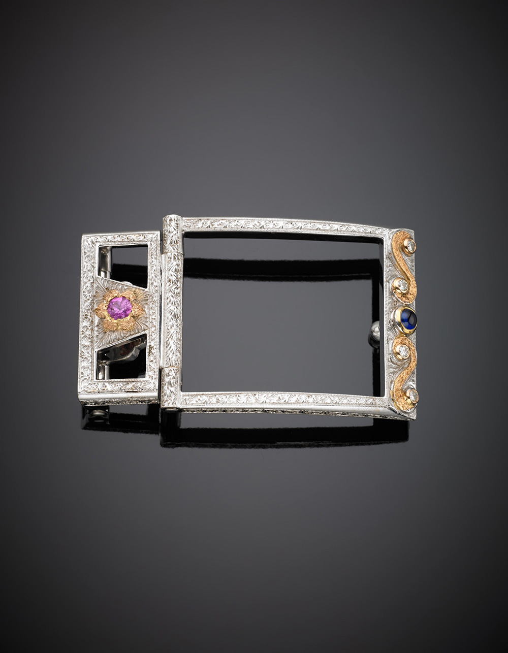 CAZZANIGA Fibbia rettangolare in oro bianco e rosa cesellato rifinita con rubino, zaffiro e diamanti, g. 50,10, lungh. cm 6 circa CAZZANIGA Pink and white chiselled gold diamond and gem set rectangular buckle, g. 50,10, length cm 6 circa