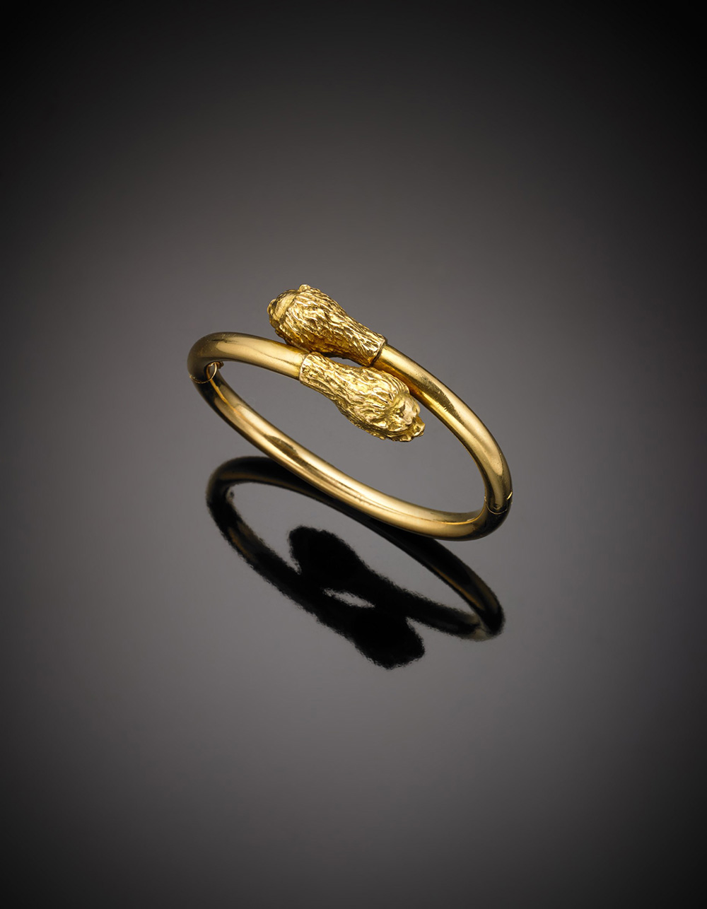 Bracciale in oro giallo alla schiava apribile con teste di leone, g.42,00 diam. interno cm 5,9 circa Yellow gold lion head cuff bracelet, g.42,00 inner diam. cm 5,9 circa