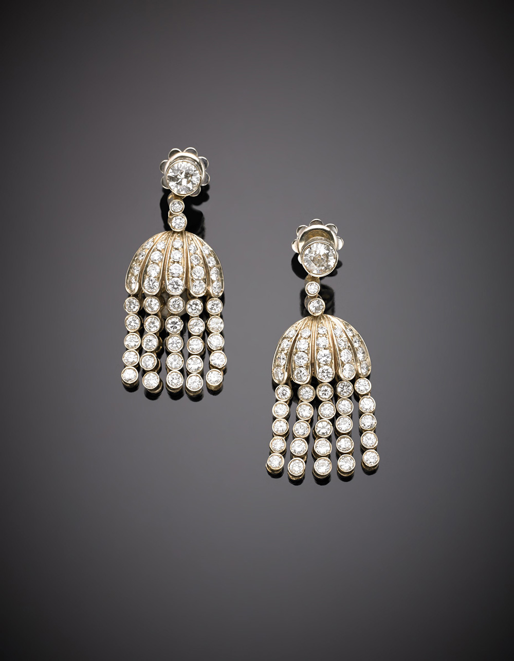 Orecchini pendenti a nappa in oro bianco e diamanti, chiusura a vite, g.8,70 lungh. cm 3 circa White gold diamond tassel pendant earrings, with screw clasp, g.8,70 length cm 3 circa