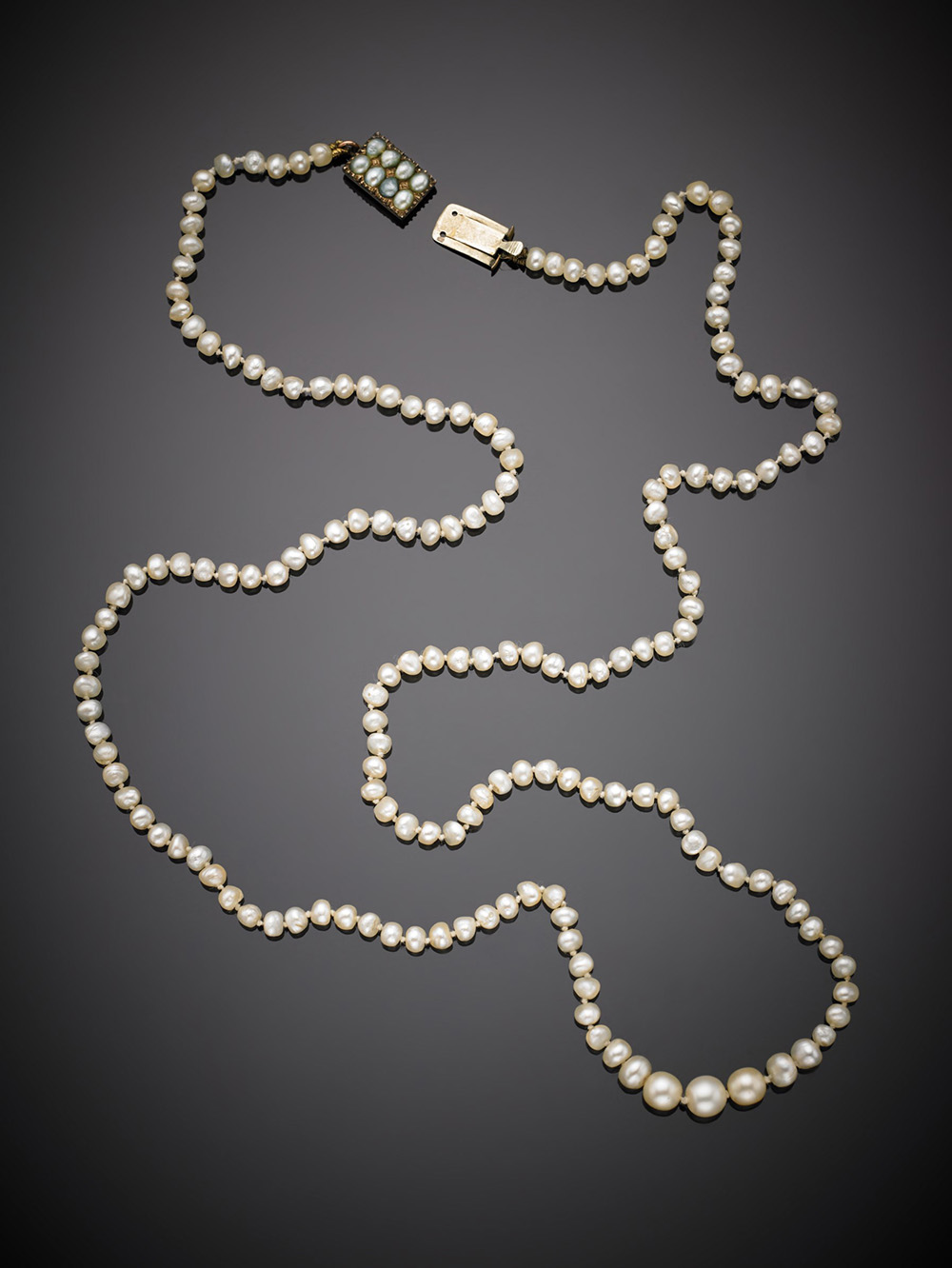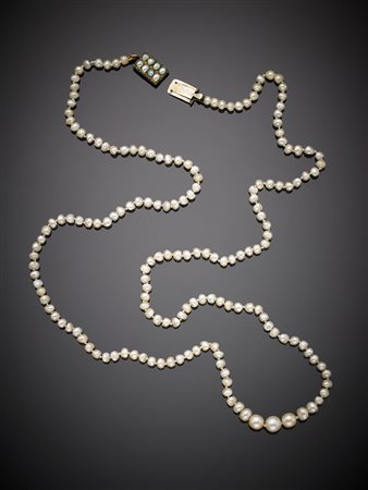 Collana di perle bianche naturali di acqua salata, a scalare da mm 3,30 a mm 5,30, con chiusura in oro giallo e mezze perle, g. 9,50, lungh. cm 62,5 Accompagnato da Short Report gemmologico CISGEM n. 5591, del 14/03/2017, Milano A white natural salt water graduated pearl necklace, pearl from mm 3,30 to mm 5,30, with yellow gold and pearl clasp, g. 9,50, length cm 62,5 Appended Gemmological Report CISGEM n. 5591 Milano 14/03/2017